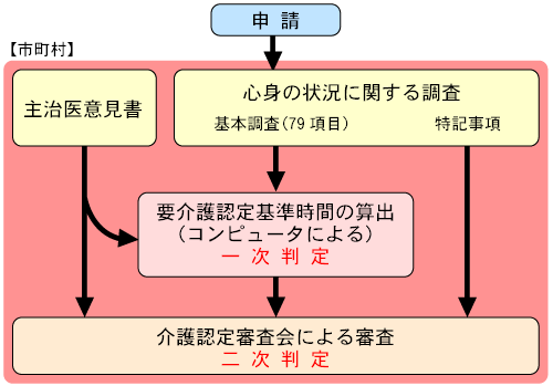 介護認定審査会は、保健・医療・福祉の学識経験者より構成され、高齢者の心身の状況調査及び主治医意見書に基づくコンピュータ判定の結果(一次判定)と主治医の意見書等に基づき審査判定を行う。